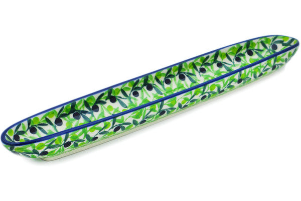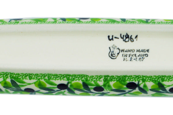 This Olive Grove 12" Olive Dish was handmade and hand decorated in Boleslawiec, Poland by skilled artisans according to old traditional methods. This is a Polish pottery Signature Unikat, which means that it has been hand painted with both sponges and brushes and it is signed by the artist who painted it. Unikat pieces are the most intricate works of art. Larger Unikat items take hours of very careful work to finish. This Polish stoneware is microwave, dishwasher, freezer, and oven safe up to 480°F. It does not contain lead or cadmium. It is part of the Olive Grove Collection.