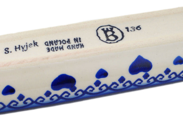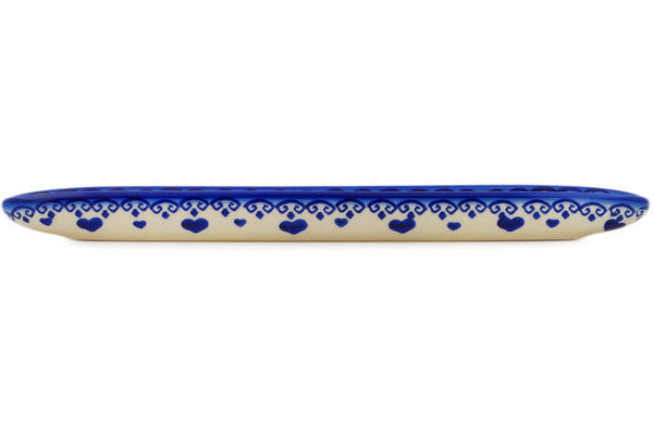 This Blue Valentine Hearts 13" Olive Dish was handmade and hand decorated in Boleslawiec, Poland by skilled artisans according to old traditional methods. This Polish stoneware is microwave, dishwasher, freezer, and oven safe up to 480°F. It does not contain lead or cadmium. It is part of the Blue Valentine Hearts Collection.