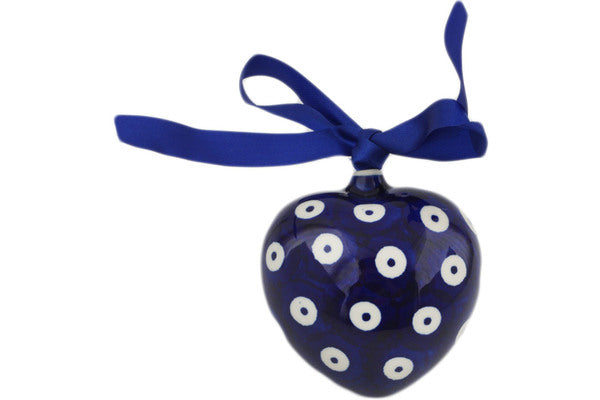 This Peacock Eyes 3" Ornament Heart was handmade and hand decorated in Boleslawiec, Poland by skilled artisans according to old traditional methods. This Polish stoneware is microwave, dishwasher, freezer, and oven safe up to 480°F. It does not contain lead or cadmium. It is part of the Peacock Eyes Collection.