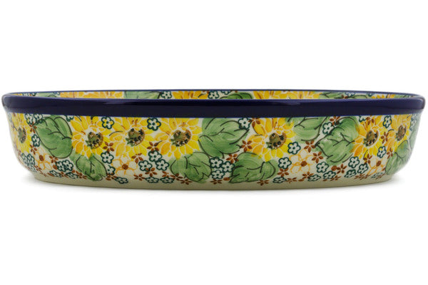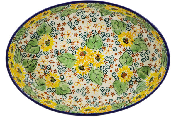 This Country Sunflower 12" Oval Baker was handmade and hand decorated in Boleslawiec, Poland by skilled artisans according to old traditional methods. This is a Polish pottery Signature Unikat, which means that it has been hand painted with both sponges and brushes and it is signed by the artist who painted it. Unikat pieces are the most intricate works of art. Larger Unikat items take hours of very careful work to finish. This Polish stoneware is microwave, dishwasher, freezer, and oven safe up to 480°F. It does not contain lead or cadmium. It is part of the Country Sunflower Collection.
