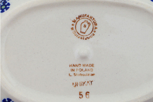 This Peacock Lattice 7" Oval Baker was handmade and hand decorated in Boleslawiec, Poland by skilled artisans according to old traditional methods. This is a Polish pottery Signature Unikat, which means that it has been hand painted with both sponges and brushes and it is signed by the artist who painted it. Unikat pieces are the most intricate works of art. Larger Unikat items take hours of very careful work to finish. This Polish stoneware is microwave, dishwasher, freezer, and oven safe up to 480°F. It does not contain lead or cadmium. It is part of the Peacock Lattice Collection.