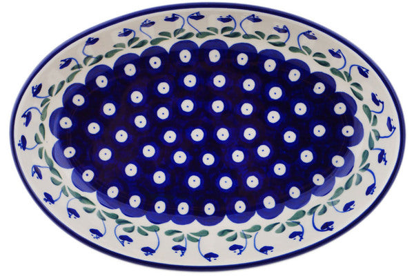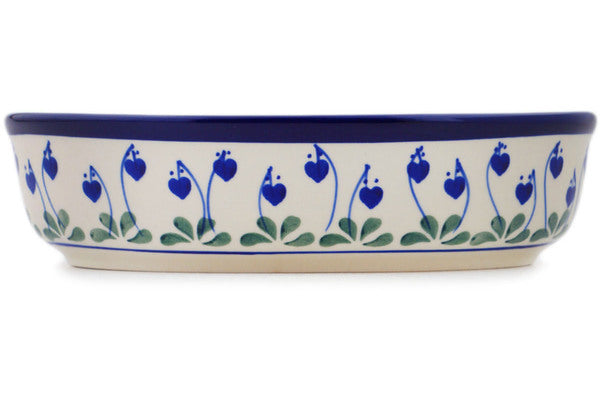 This Bleeding Heart Peacock 9" Oval Baker was handmade and hand decorated in Boleslawiec, Poland by skilled artisans according to old traditional methods. This Polish stoneware is microwave, dishwasher, freezer, and oven safe up to 480°F. It does not contain lead or cadmium. It is part of the Bleeding Heart Peacock Collection.