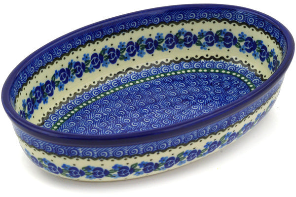 This Blue Bud Sea 9" Oval Baker was handmade and hand decorated in Boleslawiec, Poland by skilled artisans according to old traditional methods. This Polish stoneware is microwave, dishwasher, freezer, and oven safe up to 480°F. It does not contain lead or cadmium. It is part of the Blue Bud Sea Collection.