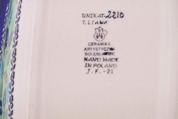 This Spring Garden 14" Oval Baker with Handles was handmade and hand decorated in Boleslawiec, Poland by skilled artisans according to old traditional methods. This is a Polish pottery Signature Unikat, which means that it has been hand painted with both sponges and brushes and it is signed by the artist who painted it. Unikat pieces are the most intricate works of art. Larger Unikat items take hours of very careful work to finish. This Polish stoneware is microwave, dishwasher, freezer, and oven safe up to 480°F. It does not contain lead or cadmium. It is part of the Spring Garden Collection.