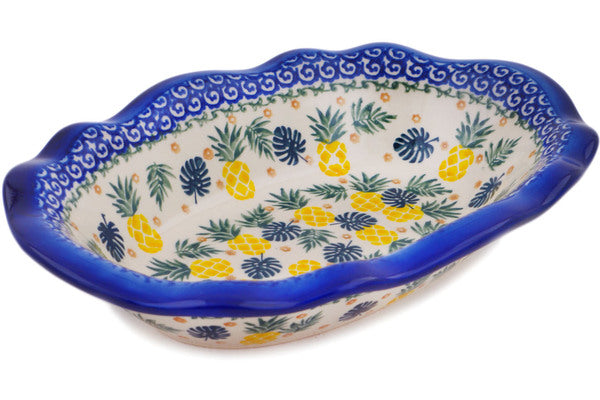 This Pineapple Parade 11" Oval Bowl was handmade and hand decorated in Boleslawiec, Poland by skilled artisans according to old traditional methods. This Polish stoneware is microwave, dishwasher, freezer, and oven safe up to 480°F. It does not contain lead or cadmium. It is part of the Pineapple Parade Collection.