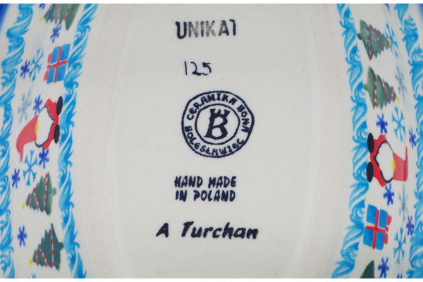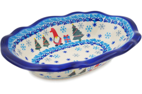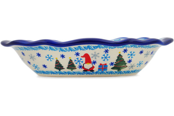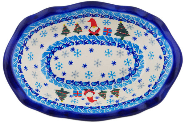 This Winter Gnome 11" Oval Bowl was handmade and hand decorated in Boleslawiec, Poland by skilled artisans according to old traditional methods. This Polish stoneware is microwave, dishwasher, freezer, and oven safe up to 480°F. It does not contain lead or cadmium. It is part of the Winter Gnome Collection.