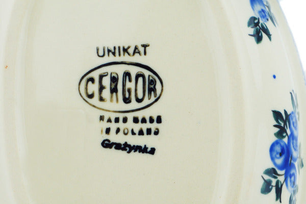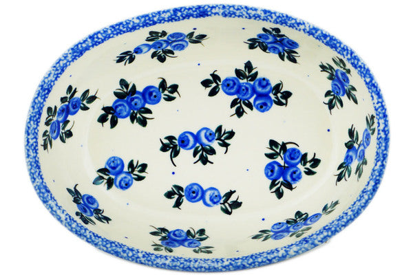 This Blue Berry Special 7" Oval Bowl was handmade and hand decorated in Boleslawiec, Poland by skilled artisans according to old traditional methods. This is a Polish pottery Signature Unikat, which means that it has been hand painted with both sponges and brushes and it is signed by the artist who painted it. Unikat pieces are the most intricate works of art. Larger Unikat items take hours of very careful work to finish. This Polish stoneware is microwave, dishwasher, freezer, and oven safe up to 480°F. It does not contain lead or cadmium. It is part of the Blue Berry Special Collection.