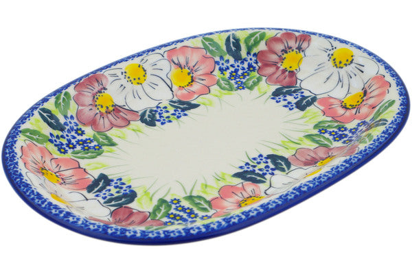 This Maroon Blossoms 11" Oval Platter was handmade and hand decorated in Boleslawiec, Poland by skilled artisans according to old traditional methods. This is a Polish pottery Signature Unikat, which means that it has been hand painted with both sponges and brushes and it is signed by the artist who painted it. Unikat pieces are the most intricate works of art. Larger Unikat items take hours of very careful work to finish. This Polish stoneware is microwave, dishwasher, freezer, and oven safe up to 480°F. It does not contain lead or cadmium. It is part of the Maroon Blossoms Collection.