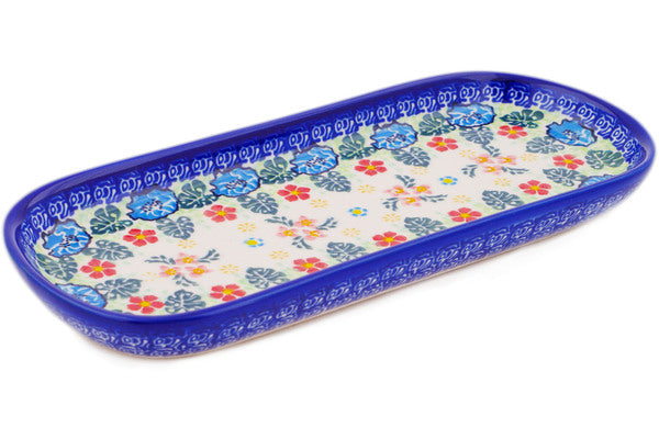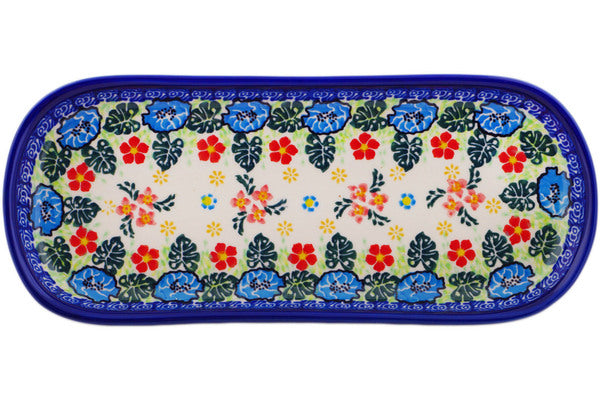This Monstera Blooms 10" Oval Platter was handmade and hand decorated in Boleslawiec, Poland by skilled artisans according to old traditional methods. This is a Polish pottery Signature Unikat, which means that it has been hand painted with both sponges and brushes and it is signed by the artist who painted it. Unikat pieces are the most intricate works of art. Larger Unikat items take hours of very careful work to finish. This Polish stoneware is microwave, dishwasher, freezer, and oven safe up to 480°F. It does not contain lead or cadmium. It is part of the Monstera Blooms Collection.