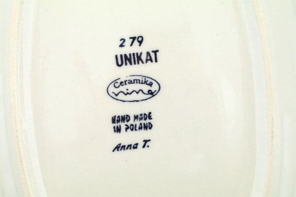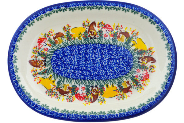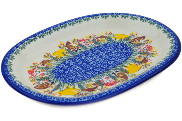 This Mushroom Love 11" Oval Platter was handmade and hand decorated in Boleslawiec, Poland by skilled artisans according to old traditional methods. This is a Polish pottery Signature Unikat, which means that it has been hand painted with both sponges and brushes and it is signed by the artist who painted it. Unikat pieces are the most intricate works of art. Larger Unikat items take hours of very careful work to finish. This Polish stoneware is microwave, dishwasher, freezer, and oven safe up to 480°F. It does not contain lead or cadmium. It is part of the Mushroom Love Collection.
