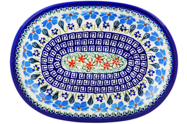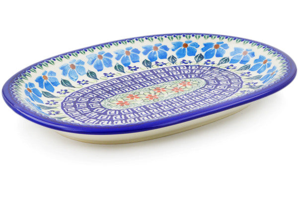 This Pansy Morning 11" Oval Platter was handmade and hand decorated in Boleslawiec, Poland by skilled artisans according to old traditional methods. This Polish stoneware is microwave, dishwasher, freezer, and oven safe up to 480°F. It does not contain lead or cadmium. It is part of the Pansy Morning Collection.