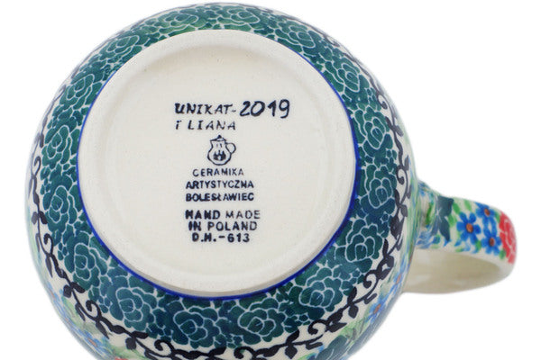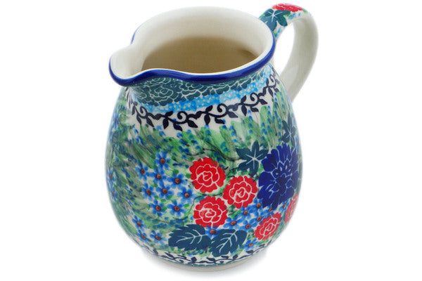 This Garden Trellis 17 oz Pitcher was handmade and hand decorated in Boleslawiec, Poland by skilled artisans according to old traditional methods. This is a Polish pottery Signature Unikat, which means that it has been hand painted with both sponges and brushes and it is signed by the artist who painted it. Unikat pieces are the most intricate works of art. Larger Unikat items take hours of very careful work to finish. This Polish stoneware is microwave, dishwasher, freezer, and oven safe up to 480°F. It does not contain lead or cadmium. It is part of the Garden Trellis Collection.