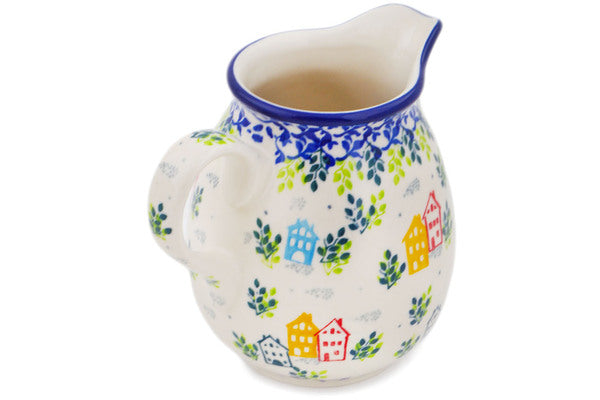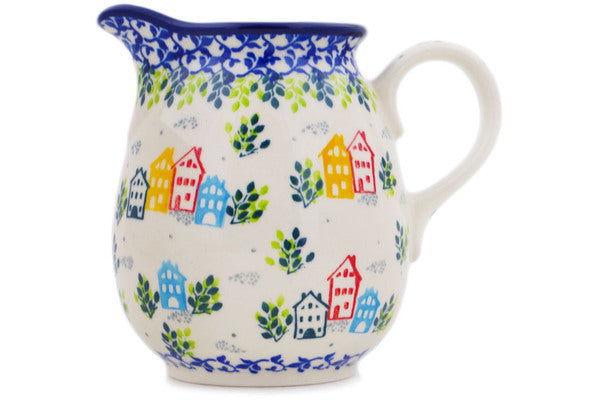 This Sweet Little Village 17 oz Pitcher was handmade and hand decorated in Boleslawiec, Poland by skilled artisans according to old traditional methods. This is a Polish pottery Signature Unikat, which means that it has been hand painted with both sponges and brushes and it is signed by the artist who painted it. Unikat pieces are the most intricate works of art. Larger Unikat items take hours of very careful work to finish. This Polish stoneware is microwave, dishwasher, freezer, and oven safe up to 480°F. It does not contain lead or cadmium. It is part of the Sweet Little Village Collection.