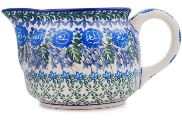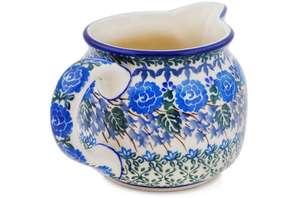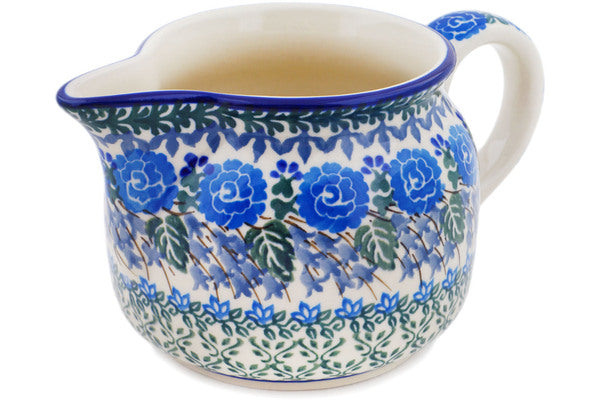 This Blue Rose Trellis 24 oz Pitcher was handmade and hand decorated in Boleslawiec, Poland by skilled artisans according to old traditional methods. This is a Polish pottery Signature Unikat, which means that it has been hand painted with both sponges and brushes and it is signed by the artist who painted it. Unikat pieces are the most intricate works of art. Larger Unikat items take hours of very careful work to finish. This Polish stoneware is microwave, dishwasher, freezer, and oven safe up to 480°F. It does not contain lead or cadmium. It is part of the Blue Rose Trellis Collection.