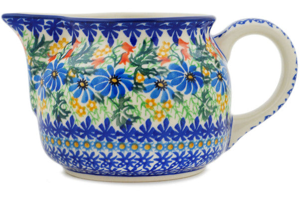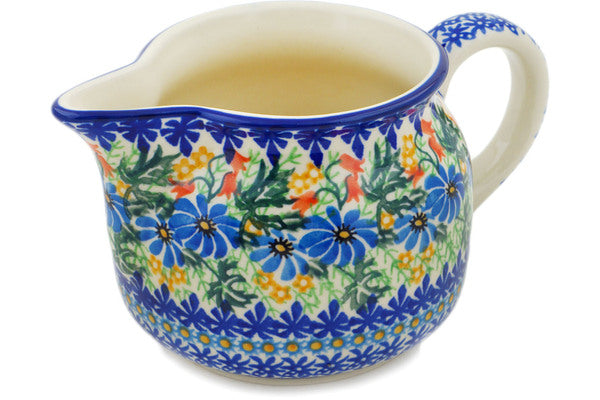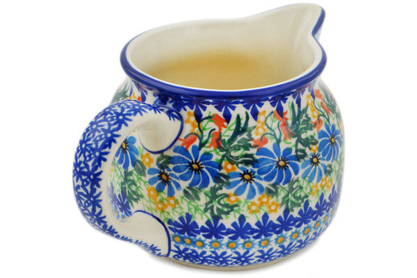 This Happy Daisy 24 oz Pitcher was handmade and hand decorated in Boleslawiec, Poland by skilled artisans according to old traditional methods. This is a Polish pottery Signature Unikat, which means that it has been hand painted with both sponges and brushes and it is signed by the artist who painted it. Unikat pieces are the most intricate works of art. Larger Unikat items take hours of very careful work to finish. This Polish stoneware is microwave, dishwasher, freezer, and oven safe up to 480°F. It does not contain lead or cadmium. It is part of the Happy Daisy Collection.