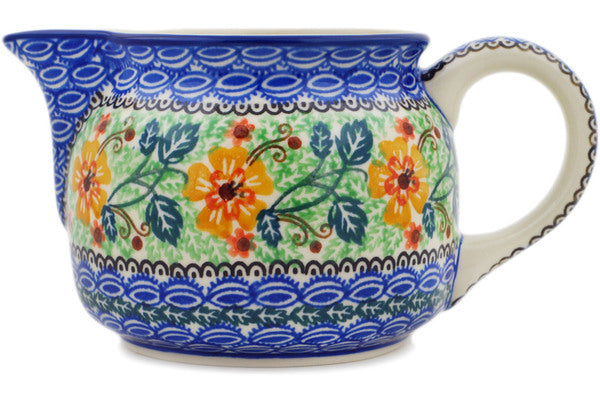 This Marigold 24 oz Pitcher was handmade and hand decorated in Boleslawiec, Poland by skilled artisans according to old traditional methods. This is a Polish pottery Signature Unikat, which means that it has been hand painted with both sponges and brushes and it is signed by the artist who painted it. Unikat pieces are the most intricate works of art. Larger Unikat items take hours of very careful work to finish. This Polish stoneware is microwave, dishwasher, freezer, and oven safe up to 480°F. It does not contain lead or cadmium. It is part of the Marigold Collection.
