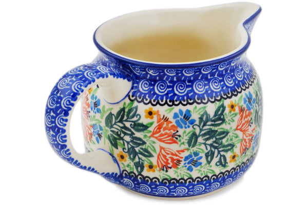 This Peach Fan Fare 24 oz Pitcher was handmade and hand decorated in Boleslawiec, Poland by skilled artisans according to old traditional methods. This is a Polish pottery Signature Unikat, which means that it has been hand painted with both sponges and brushes and it is signed by the artist who painted it. Unikat pieces are the most intricate works of art. Larger Unikat items take hours of very careful work to finish. This Polish stoneware is microwave, dishwasher, freezer, and oven safe up to 480°F. It does not contain lead or cadmium. It is part of the Peach Fan Fare Collection.