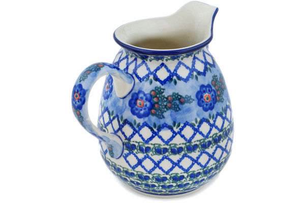 This Latice Daisy 3½ cups Pitcher was handmade and hand decorated in Boleslawiec, Poland by skilled artisans according to old traditional methods. This is a Polish pottery Signature Unikat, which means that it has been hand painted with both sponges and brushes and it is signed by the artist who painted it. Unikat pieces are the most intricate works of art. Larger Unikat items take hours of very careful work to finish. This Polish stoneware is microwave, dishwasher, freezer, and oven safe up to 480°F. It does not contain lead or cadmium. It is part of the Latice Daisy Collection.