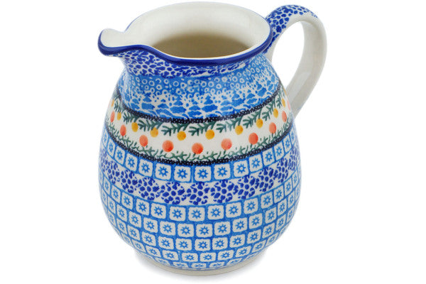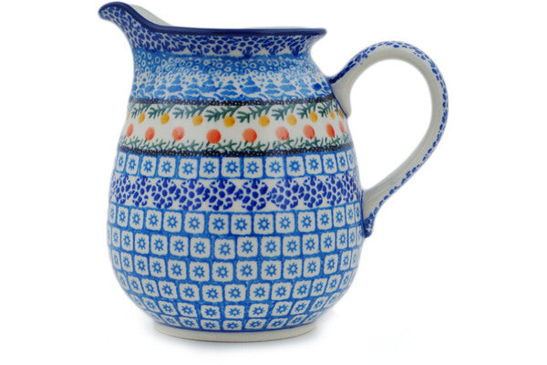 This Winter Forest 3½ cups Pitcher was handmade and hand decorated in Boleslawiec, Poland by skilled artisans according to old traditional methods. This is a Polish pottery Signature Unikat, which means that it has been hand painted with both sponges and brushes and it is signed by the artist who painted it. Unikat pieces are the most intricate works of art. Larger Unikat items take hours of very careful work to finish. This Polish stoneware is microwave, dishwasher, freezer, and oven safe up to 480°F. It does not contain lead or cadmium. It is part of the Winter Forest Collection.