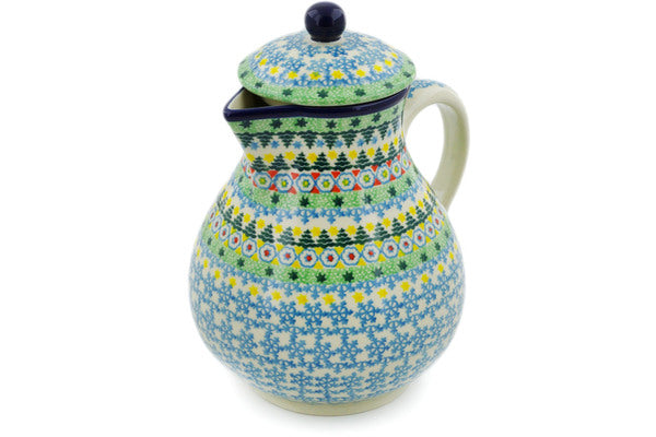 This Christmas Forest 34 oz Pitcher with Lid was handmade and hand decorated in Boleslawiec, Poland by skilled artisans according to old traditional methods. This is a Polish pottery Signature Unikat, which means that it has been hand painted with both sponges and brushes and it is signed by the artist who painted it. Unikat pieces are the most intricate works of art. Larger Unikat items take hours of very careful work to finish. This Polish stoneware is microwave, dishwasher, freezer, and oven safe up to 480°F. It does not contain lead or cadmium. It is part of the Christmas Forest Collection.