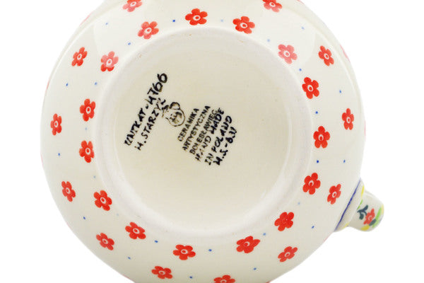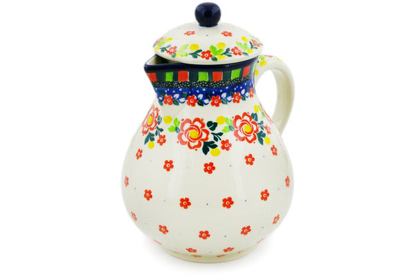 This Floral Puzzles 34 oz Pitcher with Lid was handmade and hand decorated in Boleslawiec, Poland by skilled artisans according to old traditional methods. This is a Polish pottery Signature Unikat, which means that it has been hand painted with both sponges and brushes and it is signed by the artist who painted it. Unikat pieces are the most intricate works of art. Larger Unikat items take hours of very careful work to finish. This Polish stoneware is microwave, dishwasher, freezer, and oven safe up to 480°F. It does not contain lead or cadmium. It is part of the Floral Puzzles Collection.