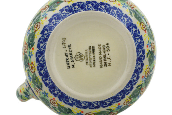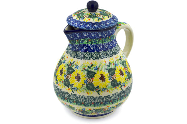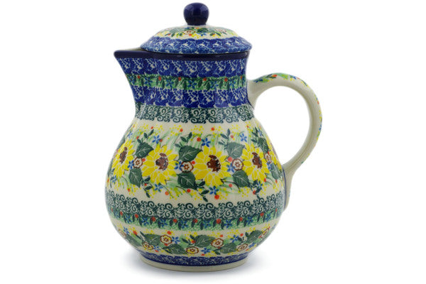 This Yellow Garden 34 oz Pitcher with Lid was handmade and hand decorated in Boleslawiec, Poland by skilled artisans according to old traditional methods. This is a Polish pottery Signature Unikat, which means that it has been hand painted with both sponges and brushes and it is signed by the artist who painted it. Unikat pieces are the most intricate works of art. Larger Unikat items take hours of very careful work to finish. This Polish stoneware is microwave, dishwasher, freezer, and oven safe up to 480°F. It does not contain lead or cadmium. It is part of the Yellow Garden Collection.