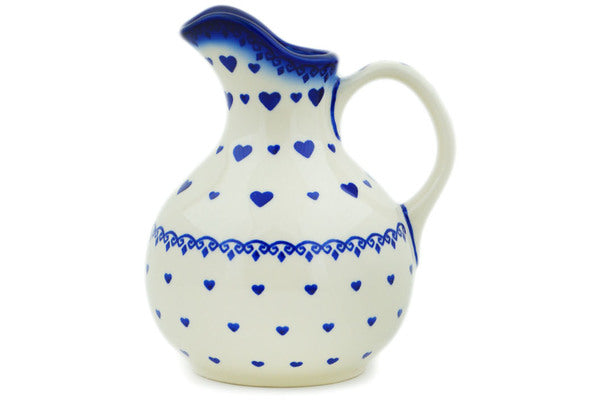 This Blue Valentine Hearts 5 Cup Pitcher was handmade and hand decorated in Boleslawiec, Poland by skilled artisans according to old traditional methods. This Polish stoneware is microwave, dishwasher, freezer, and oven safe up to 480°F. It does not contain lead or cadmium. It is part of the Blue Valentine Hearts Collection.