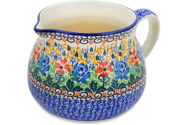 This Golden Daisies 50 oz Pitcher was handmade and hand decorated in Boleslawiec, Poland by skilled artisans according to old traditional methods. This is a Polish pottery Signature Unikat, which means that it has been hand painted with both sponges and brushes and it is signed by the artist who painted it. Unikat pieces are the most intricate works of art. Larger Unikat items take hours of very careful work to finish. This Polish stoneware is microwave, dishwasher, freezer, and oven safe up to 480°F. It does not contain lead or cadmium. It is part of the Golden Daisies Collection.