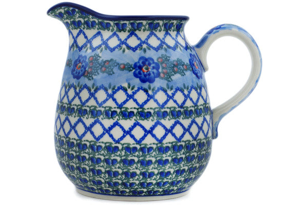 This Latice Daisy 6 Cup Pitcher was handmade and hand decorated in Boleslawiec, Poland by skilled artisans according to old traditional methods. This is a Polish pottery Signature Unikat, which means that it has been hand painted with both sponges and brushes and it is signed by the artist who painted it. Unikat pieces are the most intricate works of art. Larger Unikat items take hours of very careful work to finish. This Polish stoneware is microwave, dishwasher, freezer, and oven safe up to 480°F. It does not contain lead or cadmium. It is part of the Latice Daisy Collection.