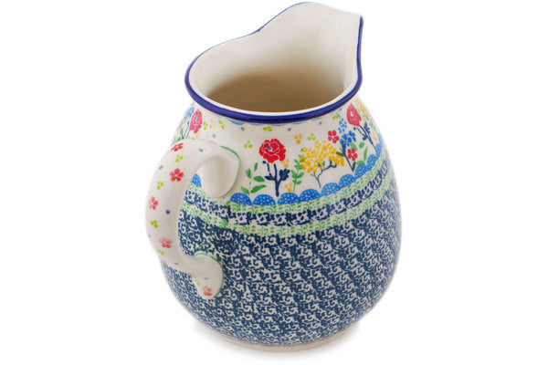 This Sunday Morning 6 Cup Pitcher was handmade and hand decorated in Boleslawiec, Poland by skilled artisans according to old traditional methods. This is a Polish pottery Signature Unikat, which means that it has been hand painted with both sponges and brushes and it is signed by the artist who painted it. Unikat pieces are the most intricate works of art. Larger Unikat items take hours of very careful work to finish. This Polish stoneware is microwave, dishwasher, freezer, and oven safe up to 480°F. It does not contain lead or cadmium. It is part of the Sunday Morning Collection.