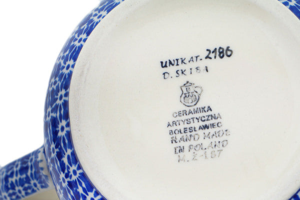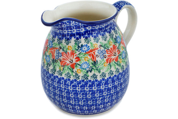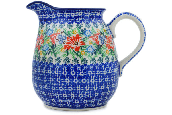This Trumpet Garden 6 Cup Pitcher was handmade and hand decorated in Boleslawiec, Poland by skilled artisans according to old traditional methods. This is a Polish pottery Signature Unikat, which means that it has been hand painted with both sponges and brushes and it is signed by the artist who painted it. Unikat pieces are the most intricate works of art. Larger Unikat items take hours of very careful work to finish. This Polish stoneware is microwave, dishwasher, freezer, and oven safe up to 480°F. It does not contain lead or cadmium. It is part of the Trumpet Garden Collection.