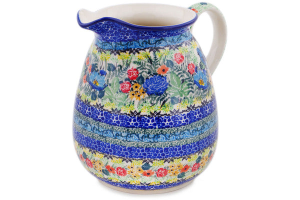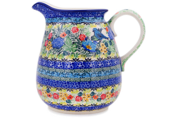 This Blue Bird Delight 67 oz Pitcher was handmade and hand decorated in Boleslawiec, Poland by skilled artisans according to old traditional methods. This is a Polish pottery Signature Unikat, which means that it has been hand painted with both sponges and brushes and it is signed by the artist who painted it. Unikat pieces are the most intricate works of art. Larger Unikat items take hours of very careful work to finish. This Polish stoneware is microwave, dishwasher, freezer, and oven safe up to 480°F. It does not contain lead or cadmium. It is part of the Blue Bird Delight Collection.