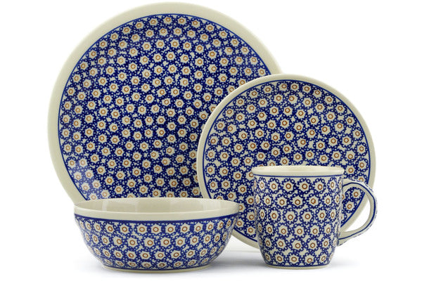 This Daisy Stamps Place Setting was handmade and hand decorated in Boleslawiec, Poland by skilled artisans according to old traditional methods. This Polish stoneware is microwave, dishwasher, freezer, and oven safe up to 480°F. It does not contain lead or cadmium. It is part of the Daisy Stamps Collection.