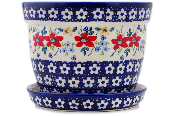 This Wild Flower Bloom 7" Planter was handmade and hand decorated in Boleslawiec, Poland by skilled artisans according to old traditional methods. This is a Polish pottery Signature Unikat, which means that it has been hand painted with both sponges and brushes and it is signed by the artist who painted it. Unikat pieces are the most intricate works of art. Larger Unikat items take hours of very careful work to finish. This Polish stoneware is microwave, dishwasher, freezer, and oven safe up to 480°F. It does not contain lead or cadmium. It is part of the Wild Flower Bloom Collection.