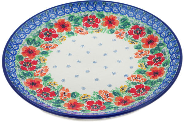 This Candy Red Poppy 10" Plate was handmade and hand decorated in Boleslawiec, Poland by skilled artisans according to old traditional methods. This is a Polish pottery Signature Unikat, which means that it has been hand painted with both sponges and brushes and it is signed by the artist who painted it. Unikat pieces are the most intricate works of art. Larger Unikat items take hours of very careful work to finish. This Polish stoneware is microwave, dishwasher, freezer, and oven safe up to 480°F. It does not contain lead or cadmium. It is part of the Candy Red Poppy Collection.