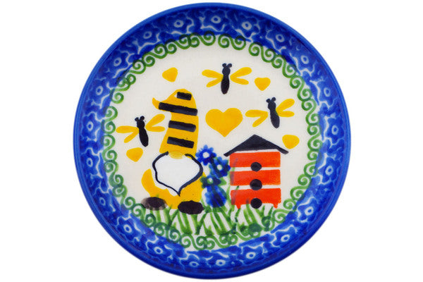 This Beekeeper Gnome 4" Plate was handmade and hand decorated in Boleslawiec, Poland by skilled artisans according to old traditional methods. This is a Polish pottery Signature Unikat, which means that it has been hand painted with both sponges and brushes and it is signed by the artist who painted it. Unikat pieces are the most intricate works of art. Larger Unikat items take hours of very careful work to finish. This Polish stoneware is microwave, dishwasher, freezer, and oven safe up to 480°F. It does not contain lead or cadmium. It is part of the Beekeeper Gnome Collection.