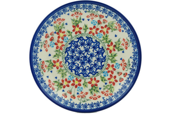 This Happy Blossoms 7" Plate was handmade and hand decorated in Boleslawiec, Poland by skilled artisans according to old traditional methods. This is a Polish pottery Signature Unikat, which means that it has been hand painted with both sponges and brushes and it is signed by the artist who painted it. Unikat pieces are the most intricate works of art. Larger Unikat items take hours of very careful work to finish. This Polish stoneware is microwave, dishwasher, freezer, and oven safe up to 480°F. It does not contain lead or cadmium. It is part of the Happy Blossoms Collection.