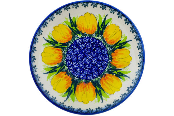 This Spring Yellow Tulip 7" Plate was handmade and hand decorated in Boleslawiec, Poland by skilled artisans according to old traditional methods. This is a Polish pottery Signature Unikat, which means that it has been hand painted with both sponges and brushes and it is signed by the artist who painted it. Unikat pieces are the most intricate works of art. Larger Unikat items take hours of very careful work to finish. This Polish stoneware is microwave, dishwasher, freezer, and oven safe up to 480°F. It does not contain lead or cadmium. It is part of the Spring Yellow Tulip Collection.