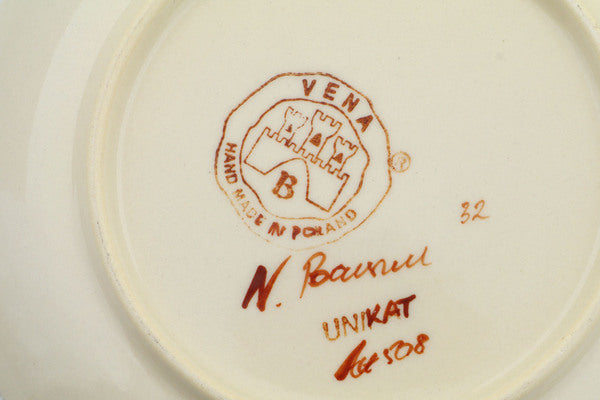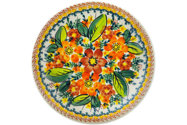 This Sunset Meadow 7" Plate was handmade and hand decorated in Boleslawiec, Poland by skilled artisans according to old traditional methods. This is a Polish pottery Signature Unikat, which means that it has been hand painted with both sponges and brushes and it is signed by the artist who painted it. Unikat pieces are the most intricate works of art. Larger Unikat items take hours of very careful work to finish. This Polish stoneware is microwave, dishwasher, freezer, and oven safe up to 480°F. It does not contain lead or cadmium. It is part of the Sunset Meadow Collection.