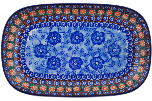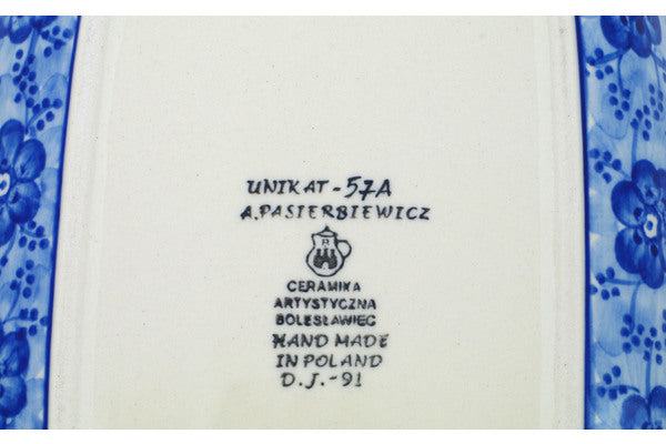 This Dancing Blue Poppies 10" Platter was handmade and hand decorated in Boleslawiec, Poland by skilled artisans according to old traditional methods. This is a Polish pottery Signature Unikat, which means that it has been hand painted with both sponges and brushes and it is signed by the artist who painted it. Unikat pieces are the most intricate works of art. Larger Unikat items take hours of very careful work to finish. This Polish stoneware is microwave, dishwasher, freezer, and oven safe up to 480°F. It does not contain lead or cadmium. It is part of the Dancing Blue Poppies Collection.