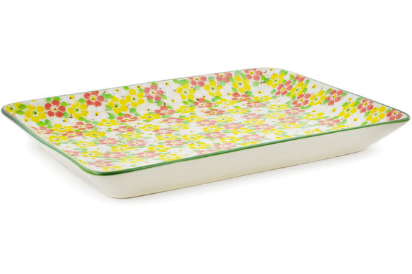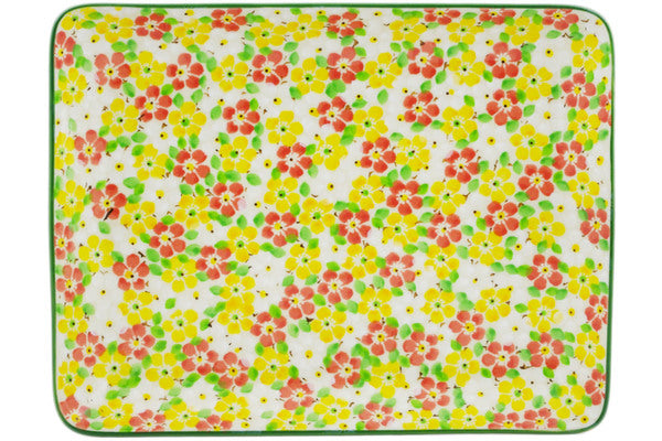 This Fertile Meadow 10" Platter was handmade and hand decorated in Boleslawiec, Poland by skilled artisans according to old traditional methods. This is a Polish pottery Signature Unikat, which means that it has been hand painted with both sponges and brushes and it is signed by the artist who painted it. Unikat pieces are the most intricate works of art. Larger Unikat items take hours of very careful work to finish. This Polish stoneware is microwave, dishwasher, freezer, and oven safe up to 480°F. It does not contain lead or cadmium. It is part of the Fertile Meadow Collection.