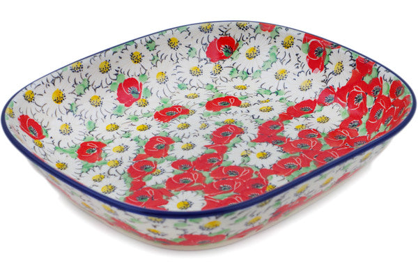 This Spring Blossom Harmony 10" Platter was handmade and hand decorated in Boleslawiec, Poland by skilled artisans according to old traditional methods. This is a Polish pottery Signature Unikat, which means that it has been hand painted with both sponges and brushes and it is signed by the artist who painted it. Unikat pieces are the most intricate works of art. Larger Unikat items take hours of very careful work to finish. This Polish stoneware is microwave, dishwasher, freezer, and oven safe up to 480°F. It does not contain lead or cadmium. It is part of the Spring Blossom Harmony Collection.