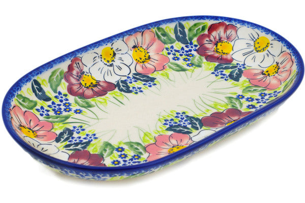 This Maroon Blossoms 11" Platter was handmade and hand decorated in Boleslawiec, Poland by skilled artisans according to old traditional methods. This is a Polish pottery Signature Unikat, which means that it has been hand painted with both sponges and brushes and it is signed by the artist who painted it. Unikat pieces are the most intricate works of art. Larger Unikat items take hours of very careful work to finish. This Polish stoneware is microwave, dishwasher, freezer, and oven safe up to 480°F. It does not contain lead or cadmium. It is part of the Maroon Blossoms Collection.