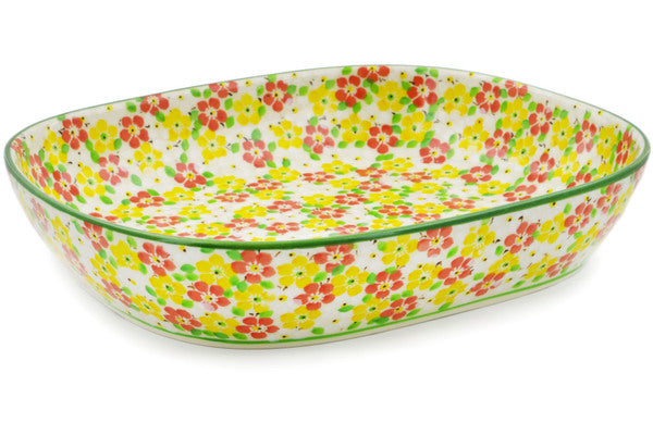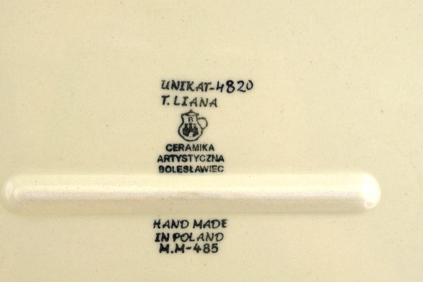 This Fertile Meadow 12" Platter was handmade and hand decorated in Boleslawiec, Poland by skilled artisans according to old traditional methods. This is a Polish pottery Signature Unikat, which means that it has been hand painted with both sponges and brushes and it is signed by the artist who painted it. Unikat pieces are the most intricate works of art. Larger Unikat items take hours of very careful work to finish. This Polish stoneware is microwave, dishwasher, freezer, and oven safe up to 480°F. It does not contain lead or cadmium. It is part of the Fertile Meadow Collection.