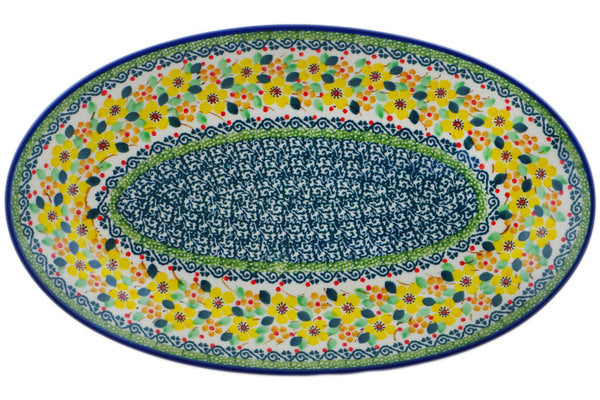 This Happy Thoughts 12" Platter was handmade and hand decorated in Boleslawiec, Poland by skilled artisans according to old traditional methods. This is a Polish pottery Signature Unikat, which means that it has been hand painted with both sponges and brushes and it is signed by the artist who painted it. Unikat pieces are the most intricate works of art. Larger Unikat items take hours of very careful work to finish. This Polish stoneware is microwave, dishwasher, freezer, and oven safe up to 480°F. It does not contain lead or cadmium. It is part of the Happy Thoughts Collection.