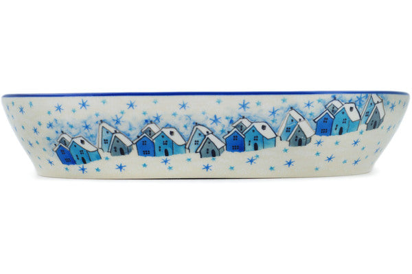 This Snowy Village 12" Platter was handmade and hand decorated in Boleslawiec, Poland by skilled artisans according to old traditional methods. This is a Polish pottery Signature Unikat, which means that it has been hand painted with both sponges and brushes and it is signed by the artist who painted it. Unikat pieces are the most intricate works of art. Larger Unikat items take hours of very careful work to finish. This Polish stoneware is microwave, dishwasher, freezer, and oven safe up to 480°F. It does not contain lead or cadmium. It is part of the Snowy Village Collection.