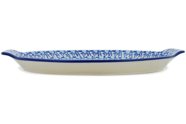 This Cobalt Forest 13" Platter was handmade and hand decorated in Boleslawiec, Poland by skilled artisans according to old traditional methods. This Polish stoneware is microwave, dishwasher, freezer, and oven safe up to 480°F. It does not contain lead or cadmium. It is part of the Cobalt Forest Collection.