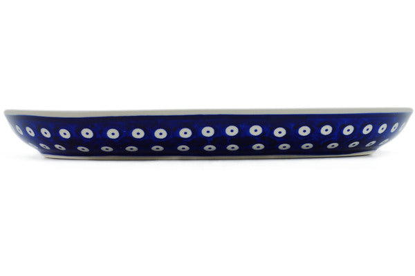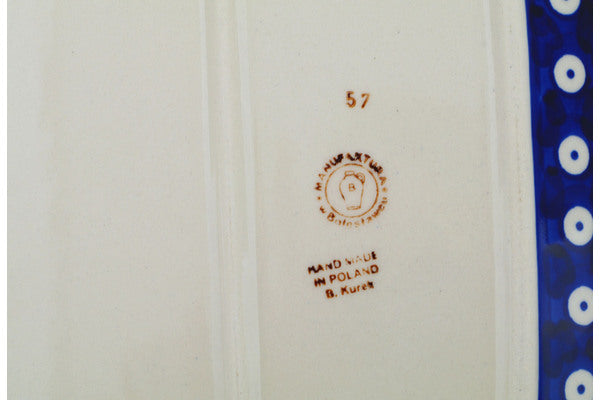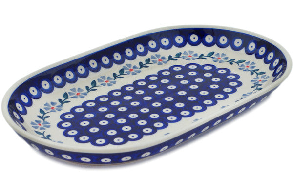 This Peacock Forget-Me-Not 13" Platter was handmade and hand decorated in Boleslawiec, Poland by skilled artisans according to old traditional methods. This Polish stoneware is microwave, dishwasher, freezer, and oven safe up to 480°F. It does not contain lead or cadmium. It is part of the Peacock Forget-Me-Not Collection.