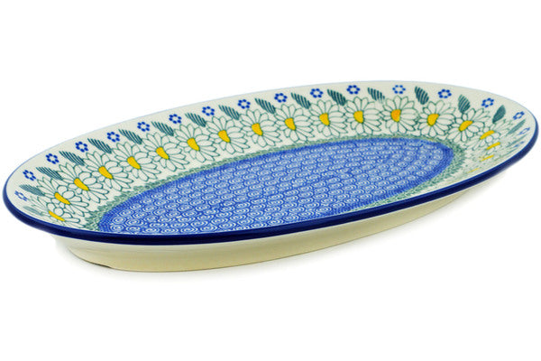 This Crazy Daisy 14" Platter was handmade and hand decorated in Boleslawiec, Poland by skilled artisans according to old traditional methods. This Polish stoneware is microwave, dishwasher, freezer, and oven safe up to 480°F. It does not contain lead or cadmium. It is part of the Crazy Daisy Collection.