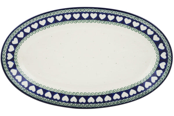This Light Hearted 14" Platter was handmade and hand decorated in Boleslawiec, Poland by skilled artisans according to old traditional methods. This Polish stoneware is microwave, dishwasher, freezer, and oven safe up to 480°F. It does not contain lead or cadmium. It is part of the Light Hearted Collection.